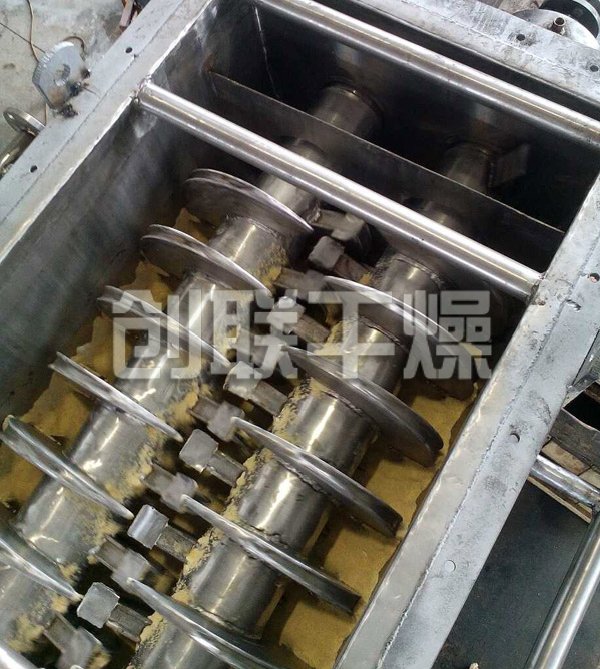 空心軸上密集排列著楔型中空漿葉,熱介質經(jīng)空心軸流經(jīng)漿葉。單位有效容積內(nèi)傳熱面積很大,熱介質溫度從-40℃到320℃,可以是水蒸汽,也可以是液體型:如熱水、導熱油等。間接傳導加熱,沒有攜帶空氣帶走熱量,熱量均用來加熱物料。熱量損失僅為通過器體保溫層向環(huán)境的散熱。楔型漿葉傳熱面具有自清潔功能。物料顆粒與楔型面的相對運動產(chǎn)生洗刷作用,能夠洗刷掉楔型面上附著物料,使運轉中一直保持著清潔的傳熱面。漿葉干燥機的殼體為Ω型,殼體內(nèi)一般安排二到四根空心攪拌軸。殼體有密封端蓋與上蓋,防止物料粉塵外泄而充分發(fā)揮作用。