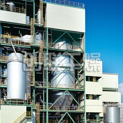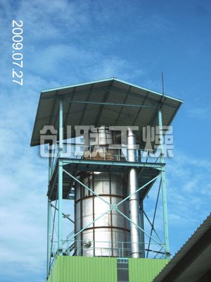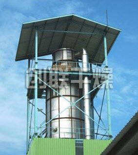 本機組工作過程為料液通過隔膜泵高壓輸入,噴出霧狀液滴,然后同熱空氣并流下降,大部分粉粒由塔底排料口收集,廢氣及其微小粉末經旋風分離器分離,廢氣由抽風機排出,粉末由設在旋風分離器下端的授粉筒收集,風機出口還可裝備二級除塵裝置,回收率在96-98%以上。