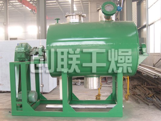 本機是一種新穎臥式間歇式真空干燥設備,濕物料經傳導蒸發,帶有刮板攪拌器不斷清除熱面上的物料,并在容器內推移形成循環流,水份蒸發后由真空泵抽出。