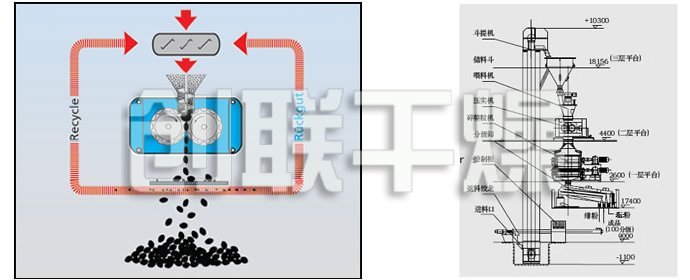 對輥式擠壓造粒的工藝原理是:干物料在壓力作用下團聚成致密堅硬的大塊(餅料),稱為擠壓過程;餅料再被破碎篩分后成為顆粒料稱為造粒過程。擠壓的作用一是將顆粒間的空氣擠掉,另外是使顆粒間距達到足夠近,以產生如范德華力、吸附力、晶橋及內嵌連接等吸引力。擠壓造粒的顆粒主要是靠分子之間的作用力形成的顆粒強度。